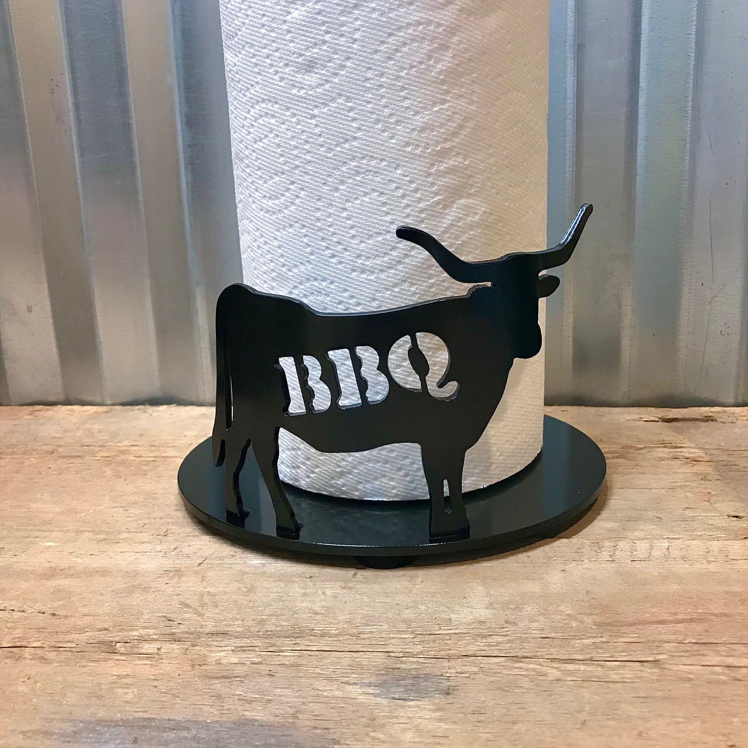 Longhorn Paper Towel Holder with BBQ Cut Out is made with a 3/16’’ thick steel base and 3/4” Rebar rod.